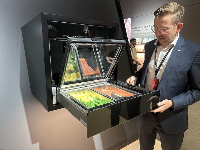 Ce tiroir de cuisson vapeur est l’un de nos coups de cœur du stand Miele et peut-être même du salon (sachant que BSH exposait aussi des équipements semblables chez ses deux marques Bosch et Siemens). En apparence simple, ce produit nous semble vraiment être la bonne idée pour qu’un maximum de personnes puissent se convertir à la cuisson vapeur. Si Miele maîtrise déjà cette méthode de cuisson, embarquée dans nombre de ses fours, ces appareils ne sont pas adaptés à tous les consommateurs. En effet, même si on est convaincu par les atouts de la vapeur, cela ne justifie pas forcément de changer son four, ni de chambouler toute sa cuisine pour en ajouter un second. Il est bien plus facile de trouver une petite place pour un tiroir encastrable, peut-être même en remplacement d’un tiroir chauffant – à la conception de la cuisine ou pourquoi pas ensuite. D’où cette astucieuse nouveauté de Miele. Ce tiroir chauffant de 14 cm de haut et d’une capacité de 3 kg embarque de nombreux programmes automatiques (une centaine) et peut notamment réaliser des cuissons 100% vapeur. On peut aussi y réchauffer des plats où y faire pousser des pâtes. Si Miele réduit les dimensions, les performances, elles, ne sont pas revues à la baisse. L’appareil utilise la même technologie Dual Steam que les fours de la marque, ce qui garantit une répartition homogène de la vapeur et donc une cuisson homogène. La cavité étant de taille réduite, par rapport à un four vapeur traditionnel, la cuisson est bien plus rapide et consomme 30% d’énergie en moins d’après Miele. Cet appareil devrait être disponible en France en 2027.