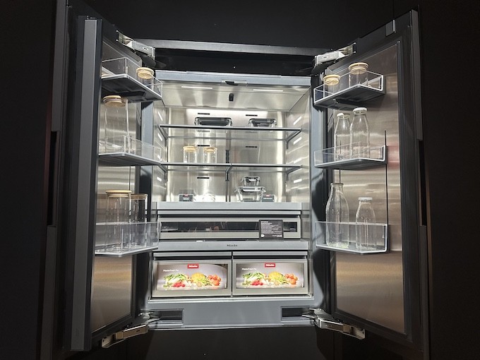 Sur le salon, nous avons également pu découvrir le french door MasterCool de 3ème génération. Ce MasterCool III profite d’un nouveau design et de la connectivité. Grâce au système Push2Open, aucune poignée n’est apparente si bien que ce réfrigérateur/congélateur encastrable de grande capacité est totalement invisible. Quand on ouvre la porte, on découvre un intérieur très soigné, la cavité en acier inoxydable brossé apportant beaucoup de cachet. D’ailleurs, bien que leur lancement soit prévu en janvier 2026, les appareils de cette gamme ont déjà reçu une récompense pour leur design (IF Design Award 2025).
