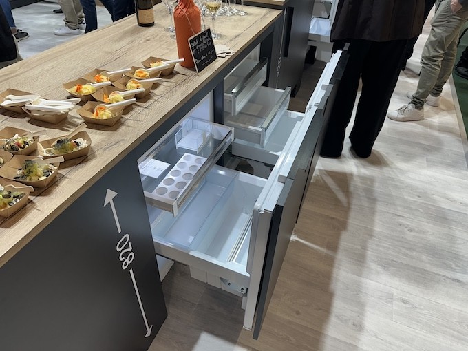 Liebherr a renouvelé toutes ses plateformes d’appareils de froid ces dernières années, en commençant par les réfrigérateurs intégrables, puis les modèles pose libre, suivis par les table top et l’année dernière les caves à vin et réfrigérateurs sous plan. Le fabricant continue d’étoffer son offre en matière d’appareils intégrables sous plan en proposant de nouveaux formats de niches. Sur son stand à Esprit Meuble, Liebherr avait mis en valeur cette famille d’équipements qui plaît beaucoup, nous indique-t-on. D’autant que la marque propose des versions à tiroirs, sachant que très peu de concurrents en produisent. Pourtant, Delphine Vey assure que cela apporte un véritable confort pour un modèle sous plan et nous en fait la démonstration (elle précise aussi qu’à dimensions égales, la capacité de stockage est très proche de celle offerte par un modèle sous plan à porte). Sans oublier que cela peut être pratique pour les personnes à mobilité réduite puisqu’on peut accéder aux aliments sur le côté de l’appareil.