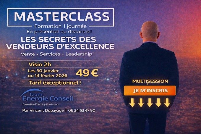 Les leaders solides ne tombent pas pendant la tempête, ils tombent après !Quand ils ont tenu trop longtemps sans se renforcer. Si vous voulez que cette année soit vraiment différente, la vraie décision ne se prend pas en février. Elle se prend maintenant. C’est pourquoi, nous vous invitons à participer à notre prochaine « MASTERCLASS » en visioconférence animée de manière interactive par Vincent Dupayage :