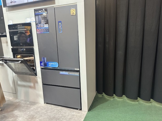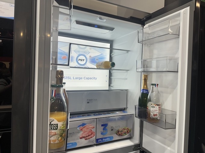 Sur le stand, on pouvait aussi voir un french door enchâssable de 90 cm de large, qui se distingue par un compartiment proposant une fonction d’ionisation. Le but est d’éliminer les germes et bactéries soit au retour des courses, soit avant de consommer les aliments. Le processus d’ionisation dure 3 minutes. Si on ne souhaite pas l’utiliser ou pas de manière systématique, ce bac se comporte comme n’importe quel autre compartiment de stockage. Pour l’instant, de telles tendances de conservation sont plutôt demandées en Asie, mais Midea souhaiterait les pousser sur le marché français. L’appareil en question est aussi pourvu d’un bac permettant de réfrigérer les aliments fragiles à une vitesse accélérée (grâce à une plaque en inox réfrigérée). Ce modèle existe également dans une version moins large de 75 cm, mais dépourvue de ces deux fonctions (qui portent les noms d’IPL Purify et V-tech fresh) – d’où le choix de Midea d’exposer le modèle de grande largeur qui devrait être vendu entre 1500 et 1600 euros (tandis que celui de 75 cm sera proposé à moins de 1000 euros). Ces grands appareils de froid affichent pour l’instant une classe E mais Midea travaille déjà à améliorer ce point. D’ailleurs, sur son stand, la marque exposait aussi un réfrigérateur side by side en classe A ; il fait partie des premiers du marché à atteindre la meilleure classe énergétique.